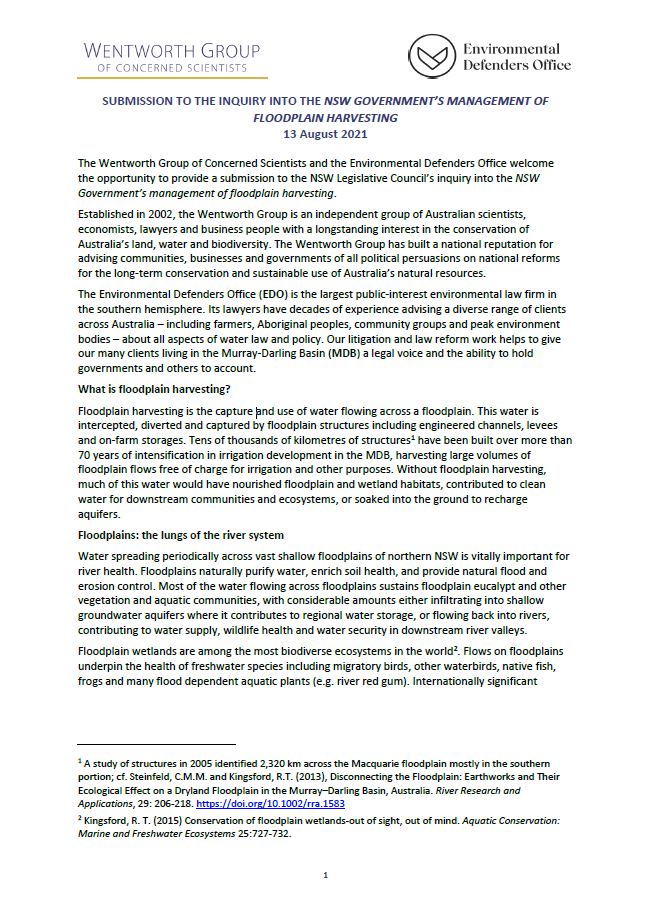 The Wentworth Group of Concerned Scientists and the Environmental Defenders Office made the following submission to the Inquiry into the NSW Government’s Management of Floodplain Harvesting.